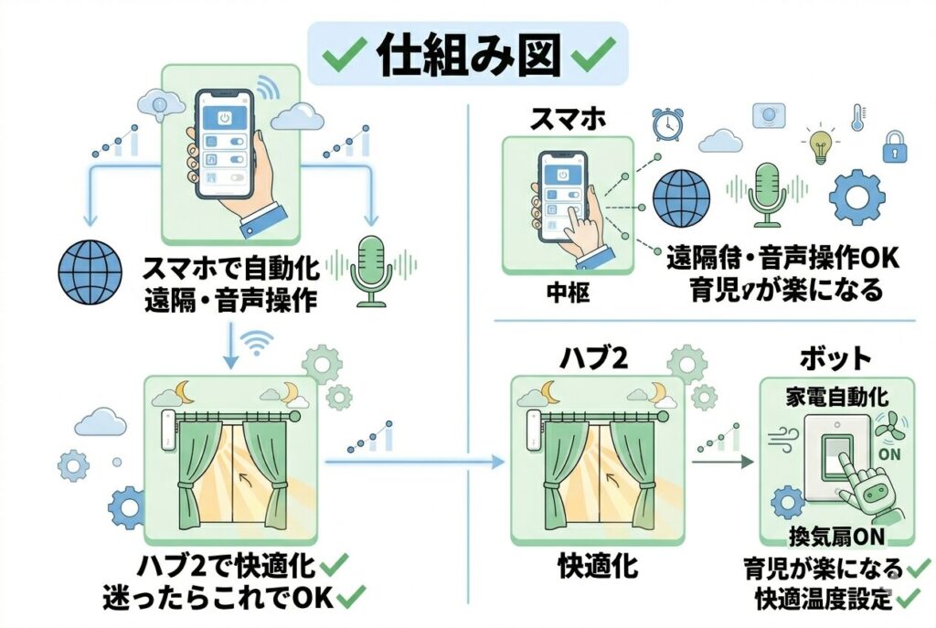 **「温湿度管理や自動化をしっかりやりたいならハブ2がおすすめ」**です。